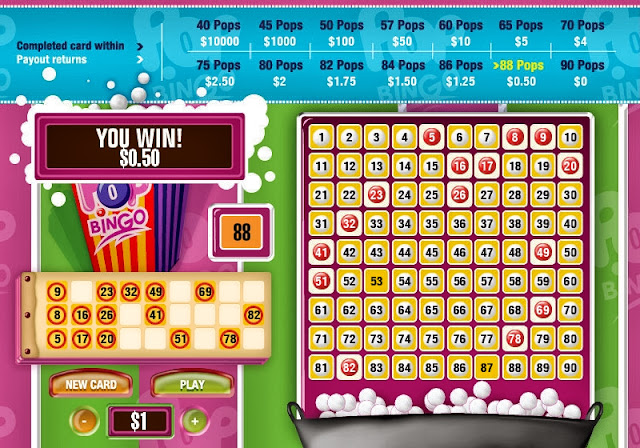 This is a simple Bingo type game. First choose the bet amount by clicking on the + and - buttons in the lower left corner of the screen. Then review the Bingo card just above the betting buttons. If you want a new card, click New Card. When you have a card that you like, click Start . The machine starts to draw balls. The number of balls drawn is displayed above the bingo card. You win according to the number of balls required to fill your card. The winning table (Number of balls - winning amount) is displayed on the higher edge of the screen.